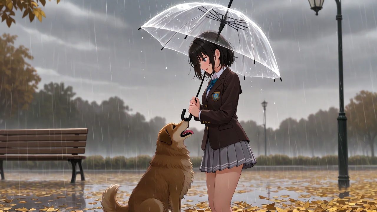 少女は、そっと傘を差し出した。 キズナは、その手の温もりに触れ、静かに尻尾を振った。