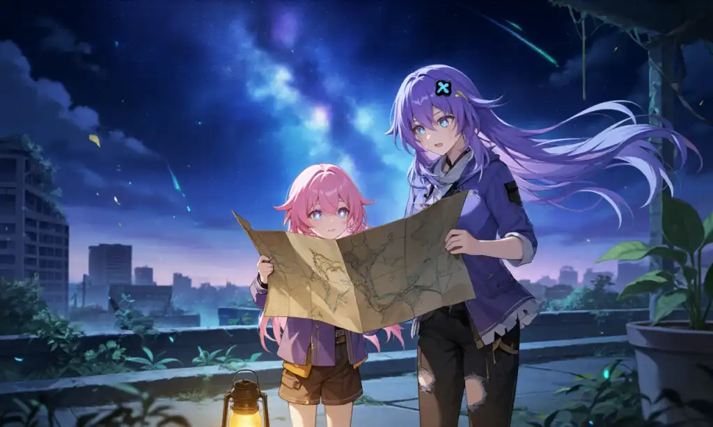 凛は小さなランタンに火を灯す。 柔らかいオレンジ色の光が、二人の顔と地図を照らした。 その光の中で、紬が指を走らせる。