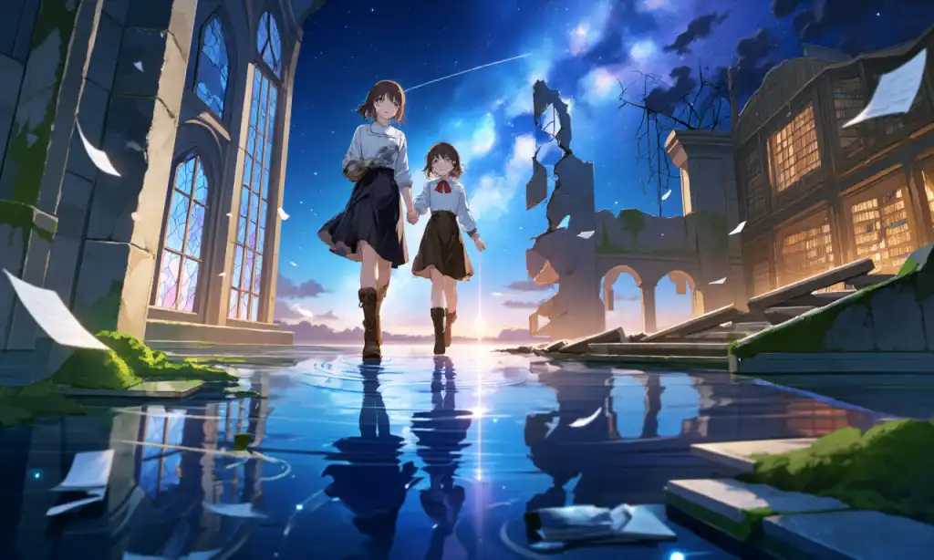 「うん。ずっと前にね。まだ私たちの家も、町も、ちゃんと生きていた頃。」 姉はそう答えながら、視線を崩れかけた図書館の入口へ向けた。 そこには、壊れたステンドグラスの欠片がまだ残っていた。月と星がその割れたガラスを透かし、揺れる光が水面に滲むように映り込む。