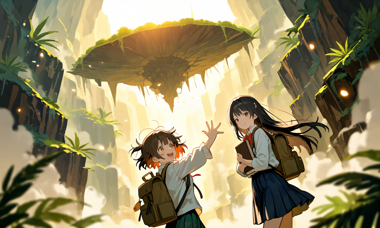 「ひゃーーー!ほんとに浮いてる!空に湖がぷかぷかしてるーー!」 なぎさは両手を振り回し、跳ねるように喜ぶ。