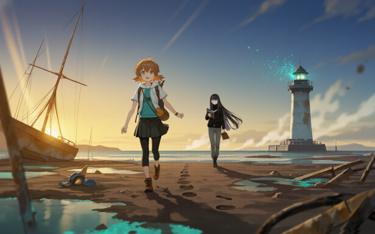 「ねぇねぇ、これって灯台の歌じゃない?ほら、海がなくても歌ってるんだよぉぉ!」 「……可能性。」 りんは短く答える。心の奥では「灯台がまだ生きている」と確信し始めていた。