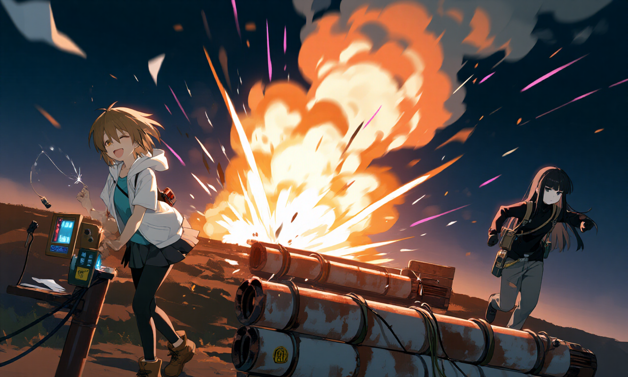煙が収まり、暴発した発射管は黒く焦げていた。夜の静けさは一瞬で吹き飛び、二人の笑いと慌てふためく声が丘に響き渡った。