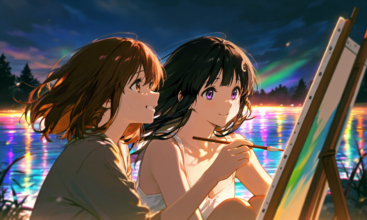湖面に揺らめく虹の残響の中で、二人はアウラの影と向き合った。絵筆を持つその姿は、言葉を発さずとも強い感情を伝えていた。未完のキャンバスに込められた想い――「描ききれなかった希望」がそこに宿っていた。