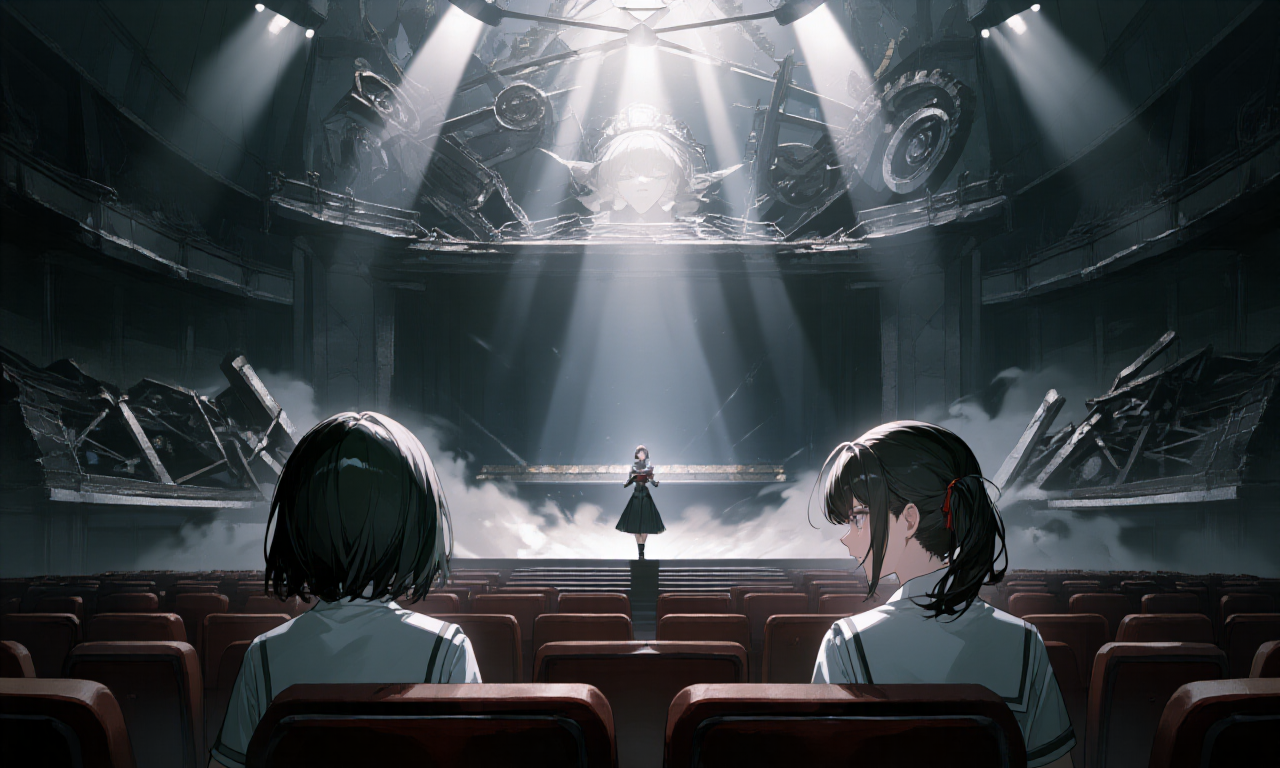 舞台の歯車が軋み、照明が一瞬だけ点滅した。まるで劇場そのものが二人に問いかけているようだった。
