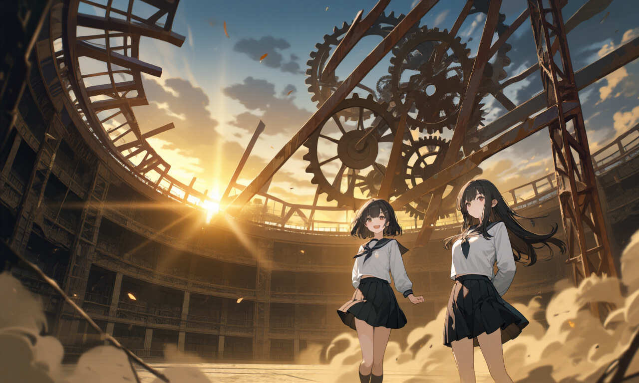 砂塵の都市を後にした二人は、風に吹かれながら荒野を進んでいた。やがて目の前に現れたのは、巨大な時計仕掛けの劇場廃墟だった。歯車がむき出しになり、錆びた鉄骨が軋む音を響かせている。