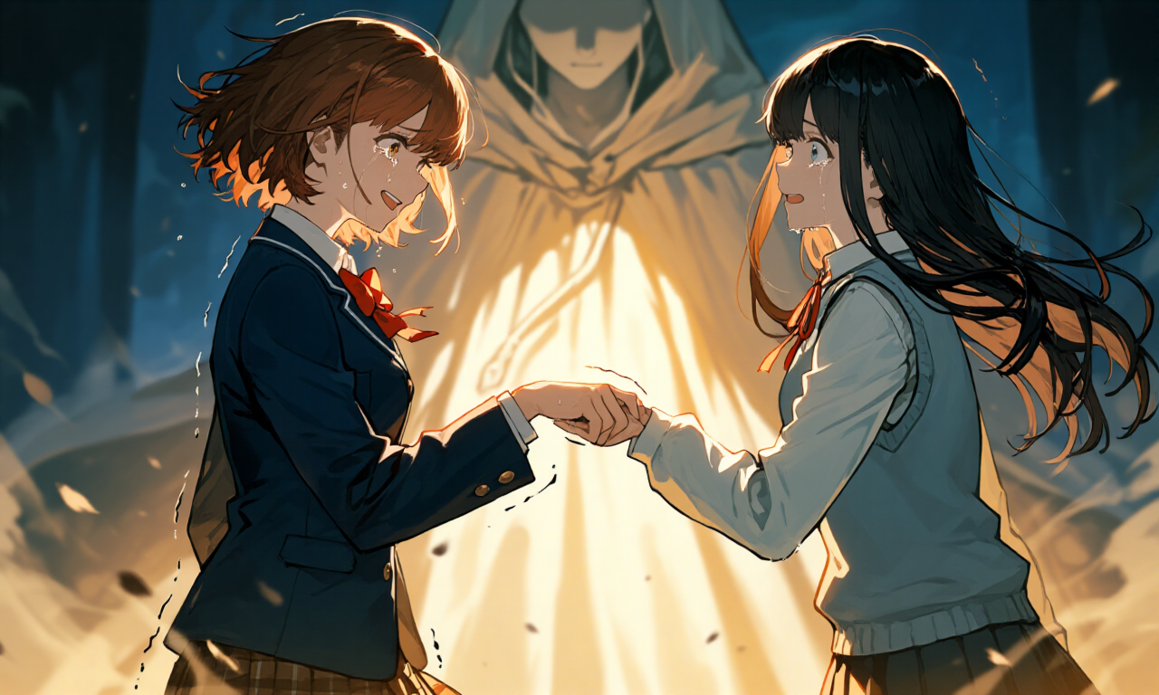 「わぁぁぁ……りんを失いたくないよぉぉ!」 「……同じ。」 りんは短く答える。心の奥では「なぎさを失うことだけは耐えられない」と強く感じていた。