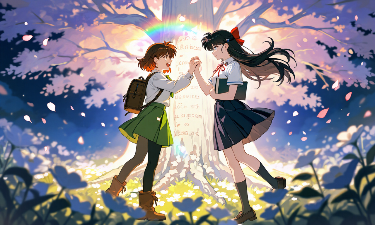 二人は花びらを幹に押し当てた。すると淡い光が広がり、文字が刻まれていく。 「互いを選び続ける」――その言葉が樹に刻まれ、庭全体が虹色に輝いた。