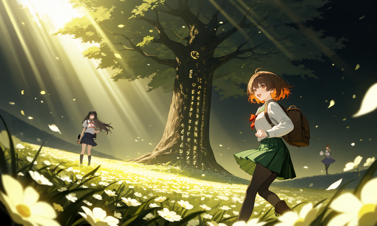 「ねぇねぇ!これ、みんなの思い出が刻まれてるんだねぇぇ!すっごいロマンチックーー!」 「……記録。」 りんは冷静に答える。心の奥では「この樹こそ世界の記憶の核だ」と確信していた。