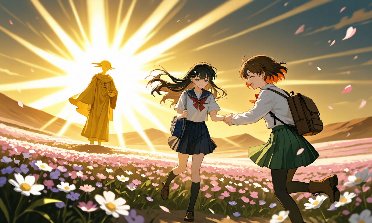ソルは黄金の光をさらに強め、二人を包み込んだ。大地の鼓動は最高潮に達し、花々が一斉に咲き誇り、世界は完全に蘇った。