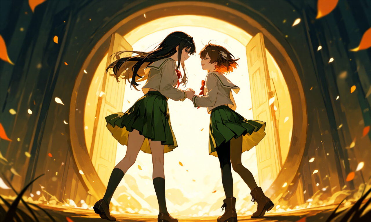 二人は手を取り合い、光の輪へと歩み始めた。