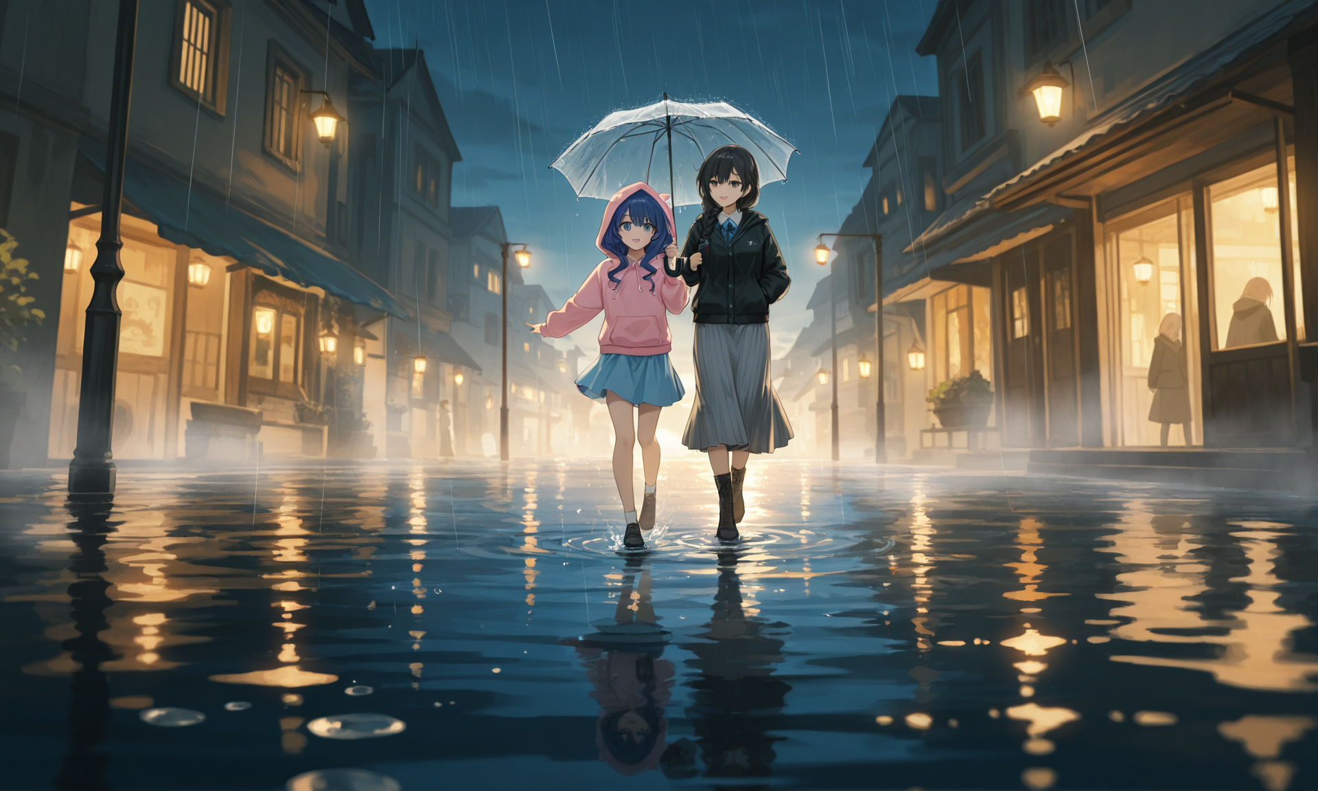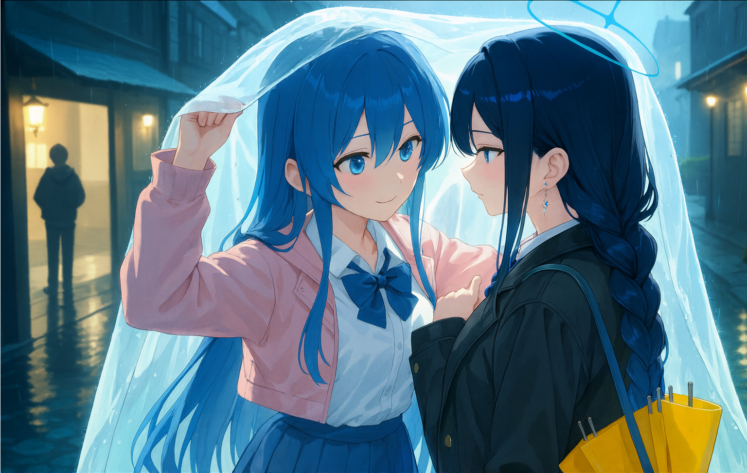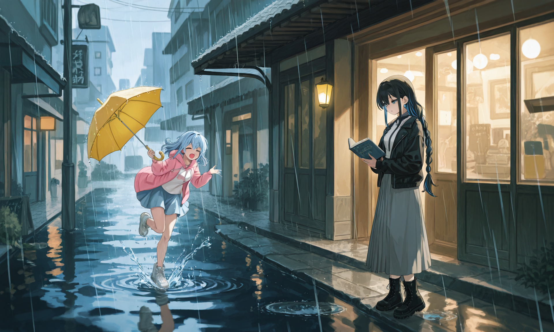 その瞬間、二人の間に小さな絆が芽生えた。 雨の世界で、笑う少女と静かな少女。 互いの違いが、互いを支え合う力になる――そんな予感が、確かにあった。