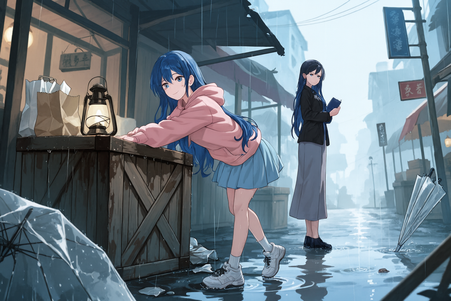 雨に沈む街角。そこに立つ二人の少女。 一人は過去の賑わいを夢見て笑い、もう一人は静かにその夢を受け止める。 その光景は、終末の世界に残された小さな希望のように見えた。