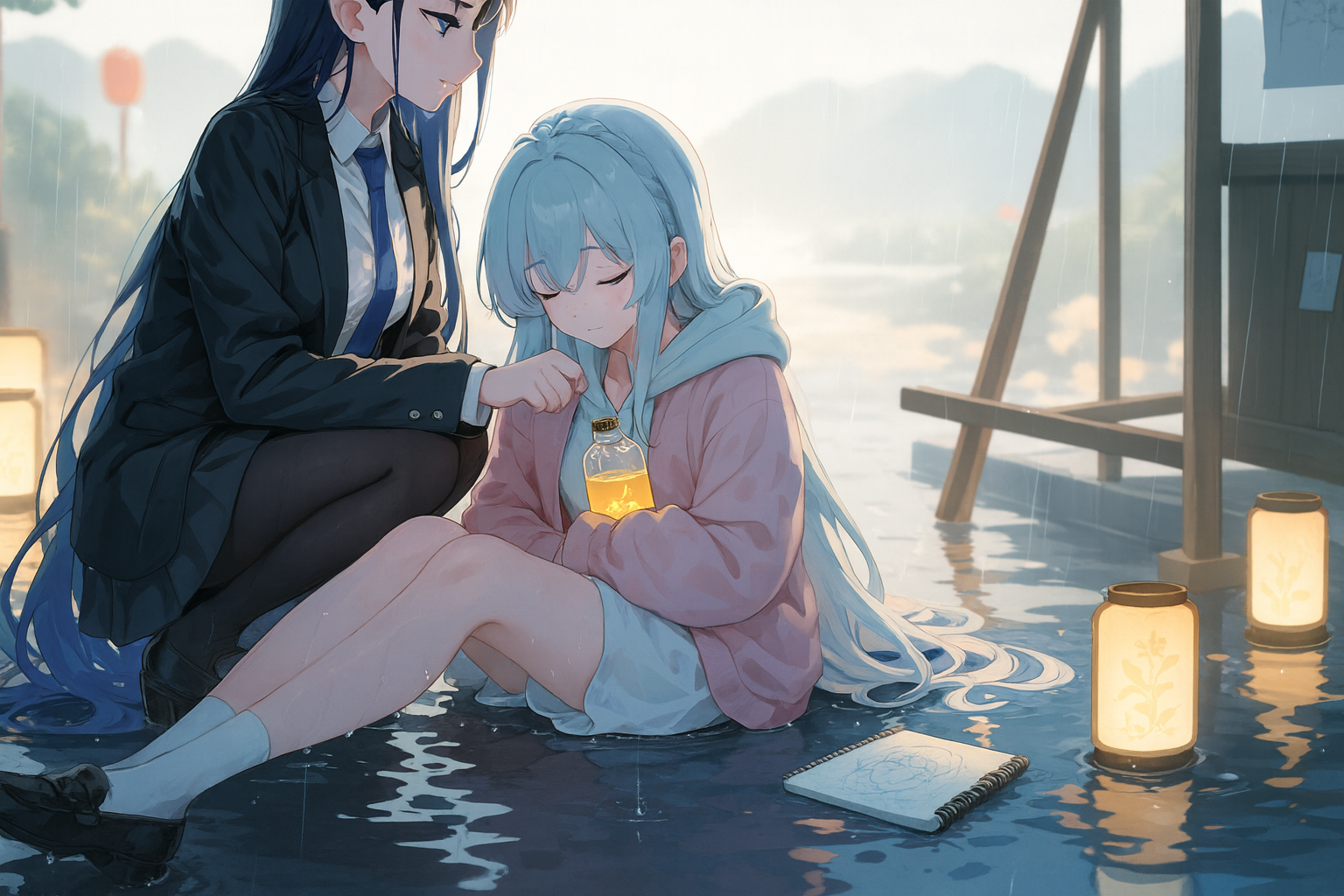 二人は互いの違いを認め合いながら、自然に支え合っていた。 なぎさの明るさはりんの冷静さを照らし、りんの冷静さはなぎさの無邪気さを守る。 そのバランスが、雨の街角に小さな友情の芽を育てていた。