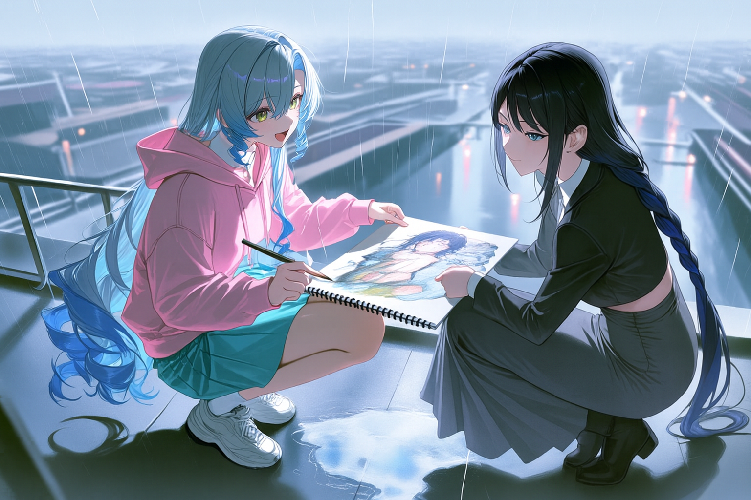 なぎさは濡れたページをめくり、描きかけの街の絵を見せる。 「これねぇ、雨で滲んじゃったけど……なんか、街が生きてるみたいに見えるんだよー!」 「……悪くない」 「やったー!りんちゃんに褒められたぁ!」 なぎさは嬉しそうに声を上げ、りんは小さく目を細める。