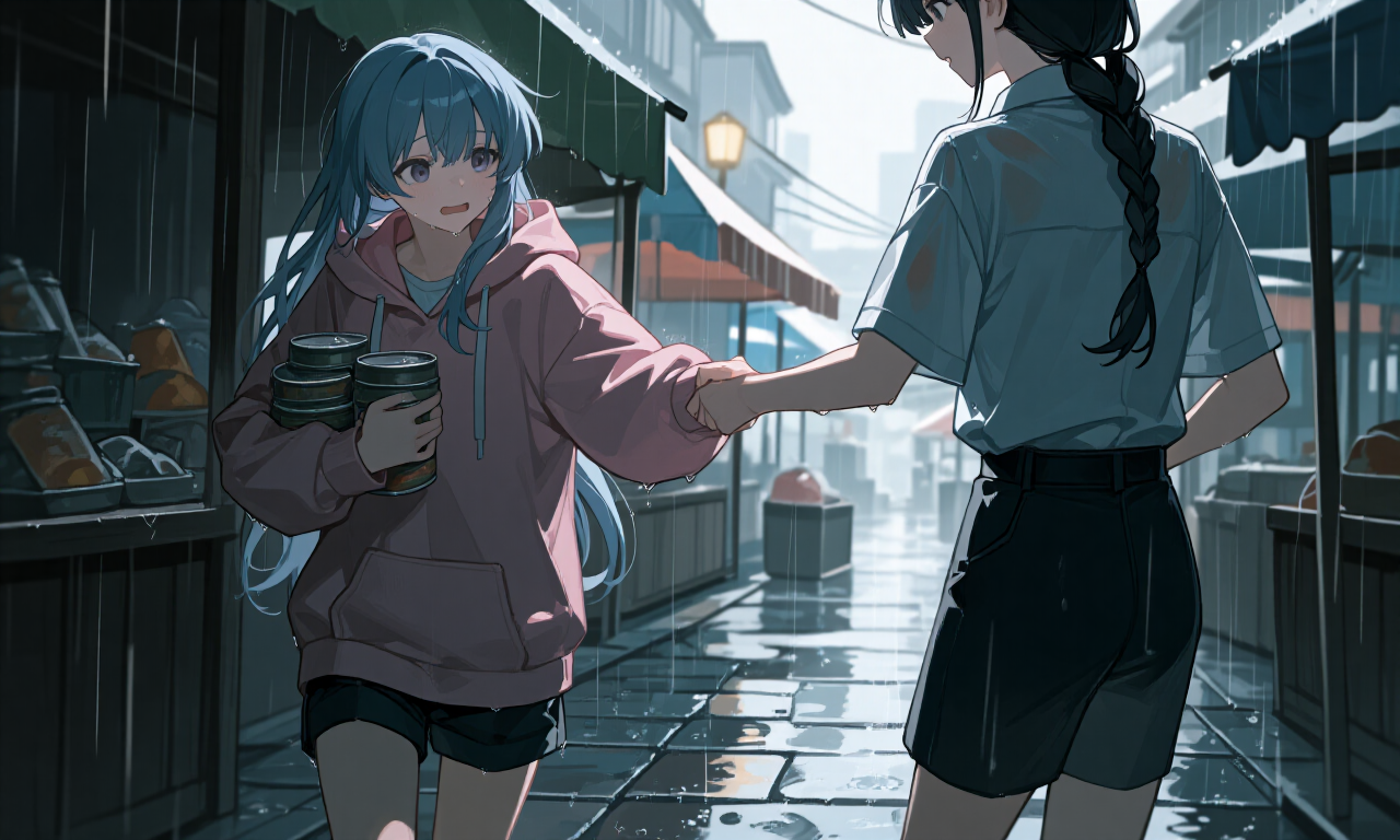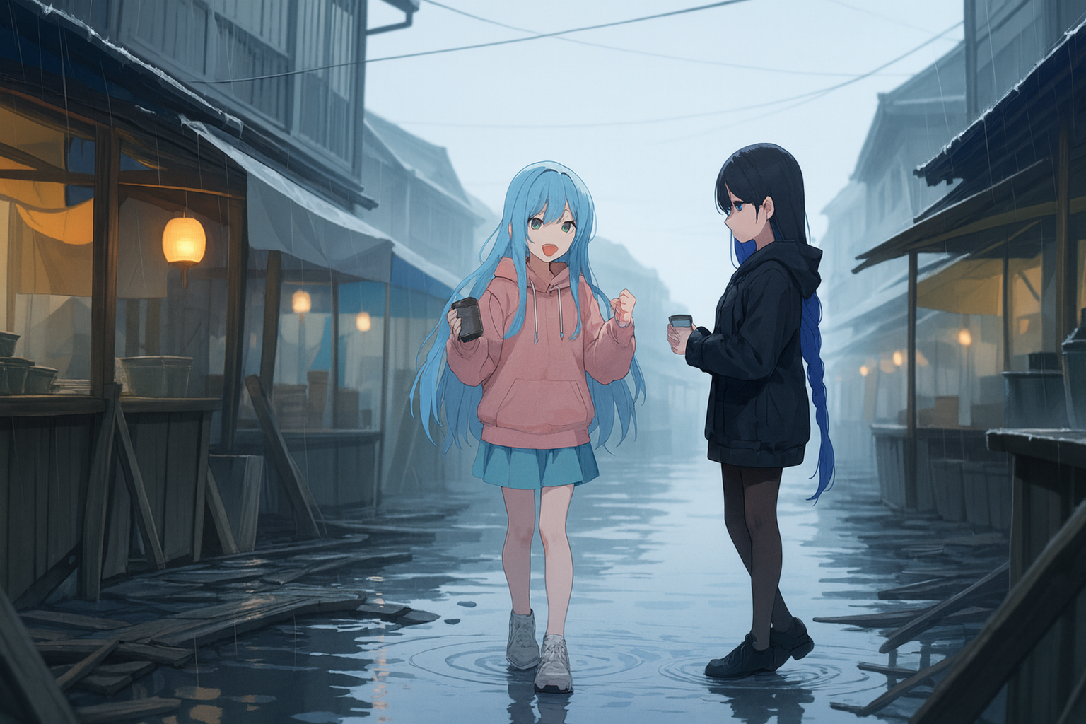 沈みゆく市場の中で、二人の声だけが鮮やかに響いていた。 雨音は絶え間なく続き、街を覆っている。けれど、なぎさの笑い声はその静けさを破り、りんの心に小さな温かさを灯していた。