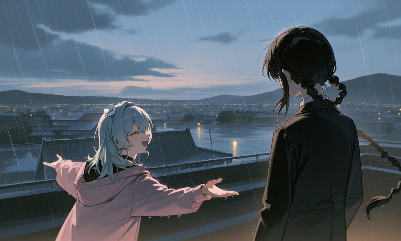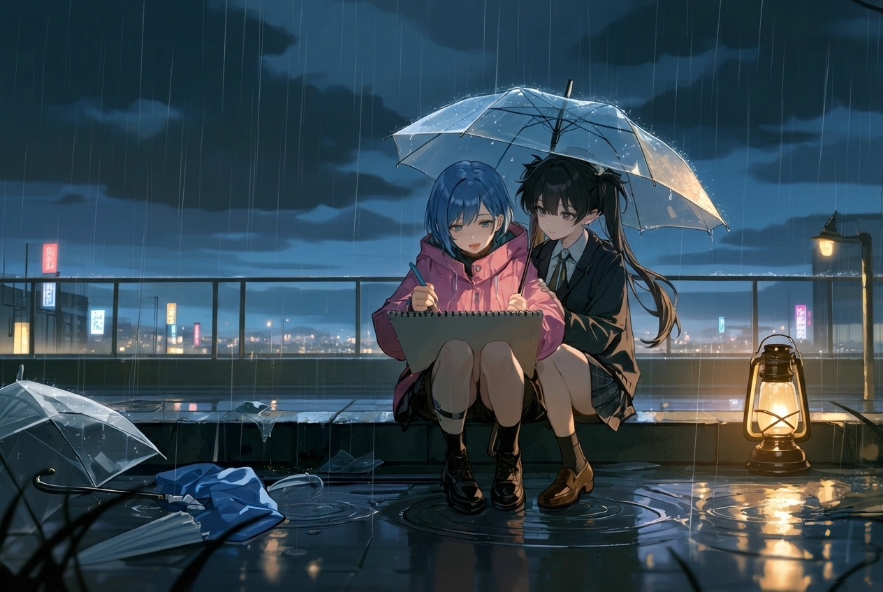 雨音に包まれた屋上で、少女たちの笑い声が響く。 沈みゆく街を背景に、二人のスケッチは確かに「再会の証」となっていた。