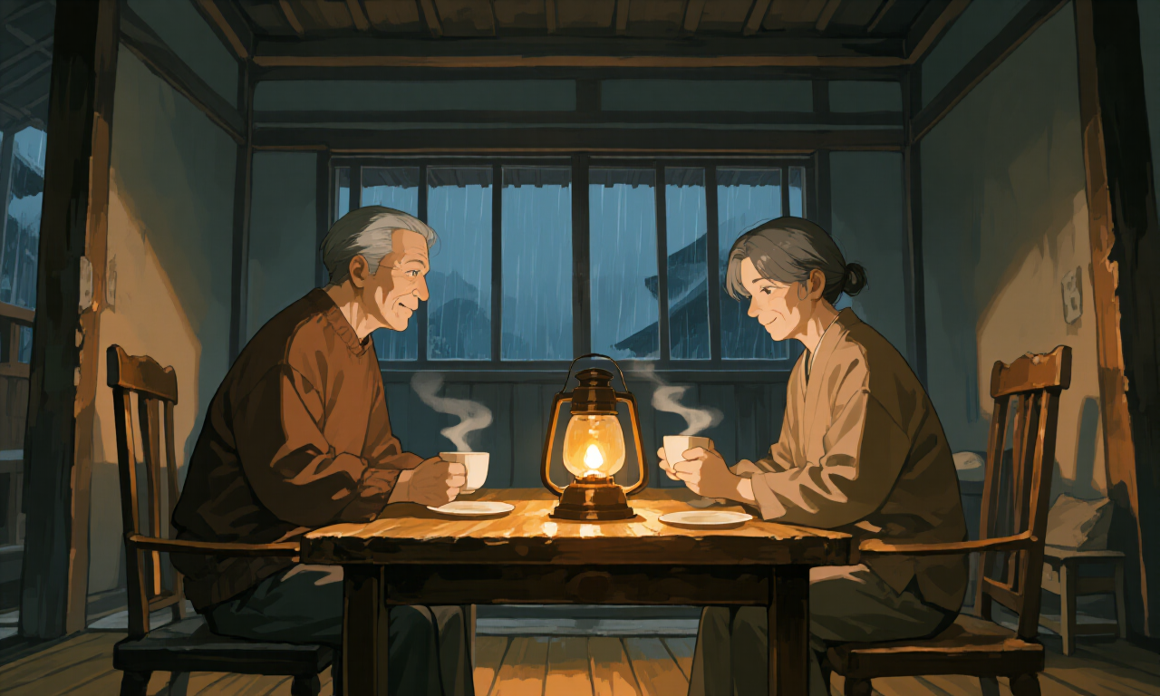 ランタンの炎が少しだけ強くなり、居間を柔らかく照らしていた。