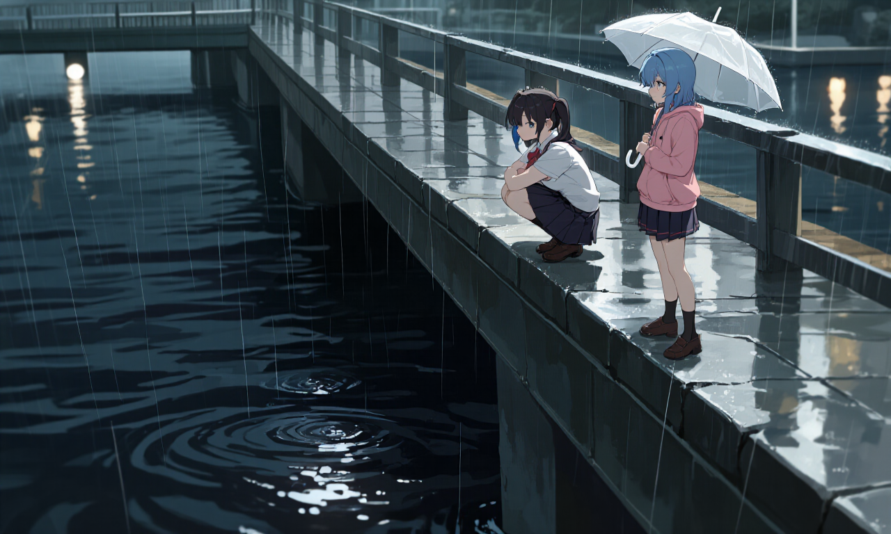 なぎさは傘をぶんぶん振りながら足元を覗き込み、りんはその少し前を歩いていた。 ランタンの淡い光が、二人の足元だけをかろうじて照らしている。 雨音は一定のリズムを刻み、遠くでは何かが崩れるような低い音が混じっていた。 建物の影は水面に溶け、どこまでが道でどこからが水なのか、境界が曖昧になっている。