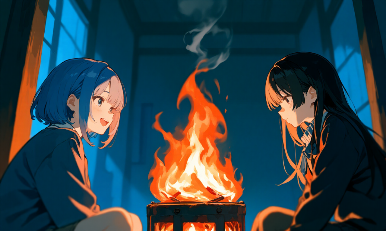 お湯が沸くのを待つ間、あたしたちは小さな炎を囲んでいた。 オレンジ色の光が、りんちゃんの横顔を照らす。 いつも冷静な彼女の瞳の奥に、揺れる炎が静かに映っていた。