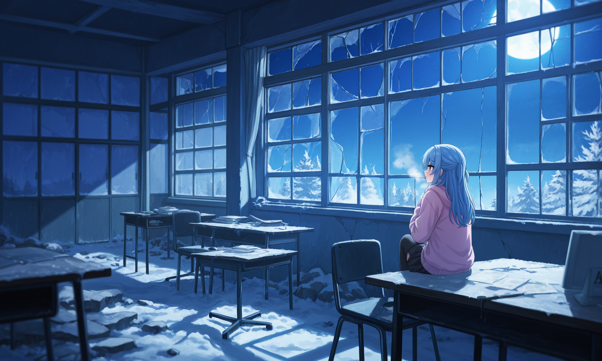 ここは、かつてサラリーマンたちが戦っていたオフィスビル。 でも今の主役は、割れた窓から吹き込む“北極の刺客”みたいな寒風。 書類も椅子も机も、みんな凍死寸前で静かに震えている。
