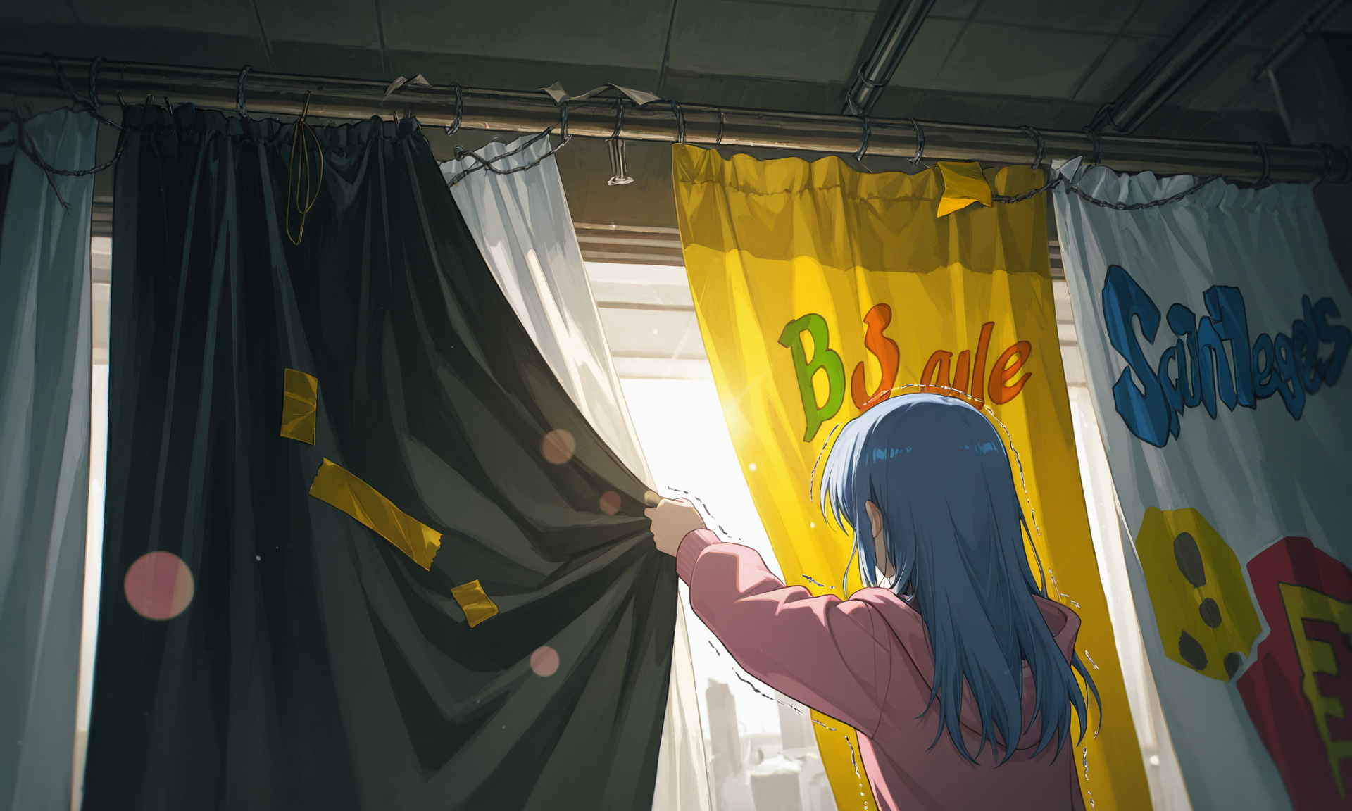 使えそうな布をかき集める。 厚手の遮光カーテン、ビニール製の垂れ幕、そして古い事務机の引き出しから発掘したガムテープ。