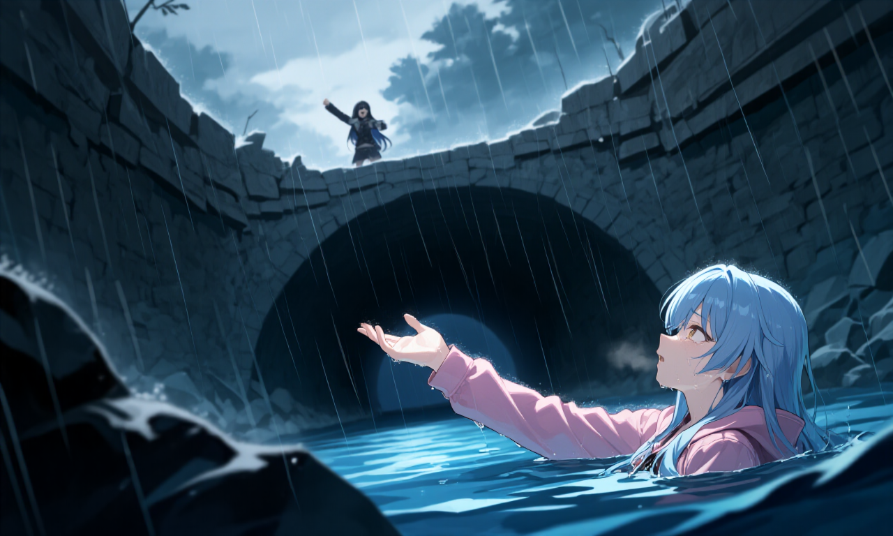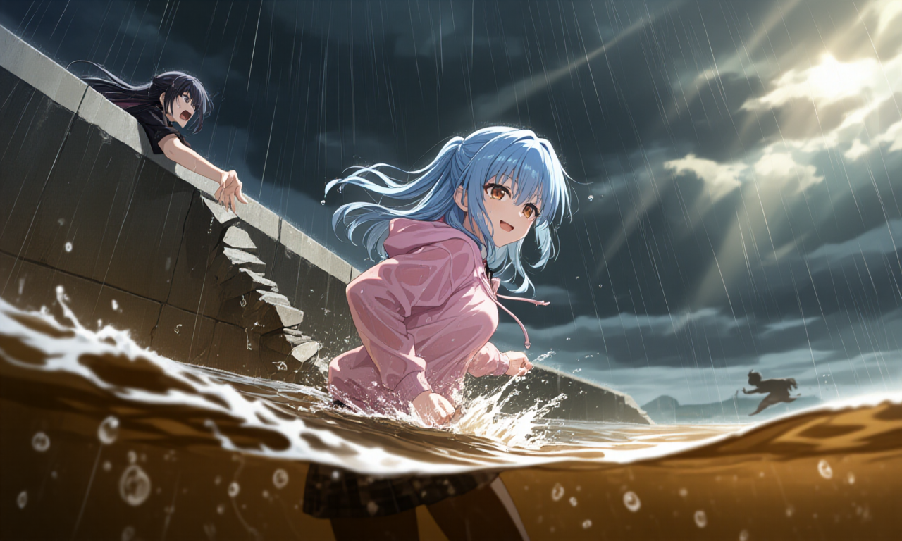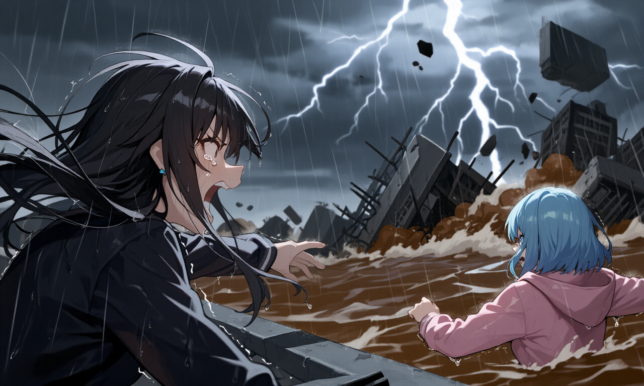 崩れかけた歩道の縁に足をかけ、 あたしは自分の安全なんて一ミリも計算せず、 濁流へ向かって飛び込んだ。