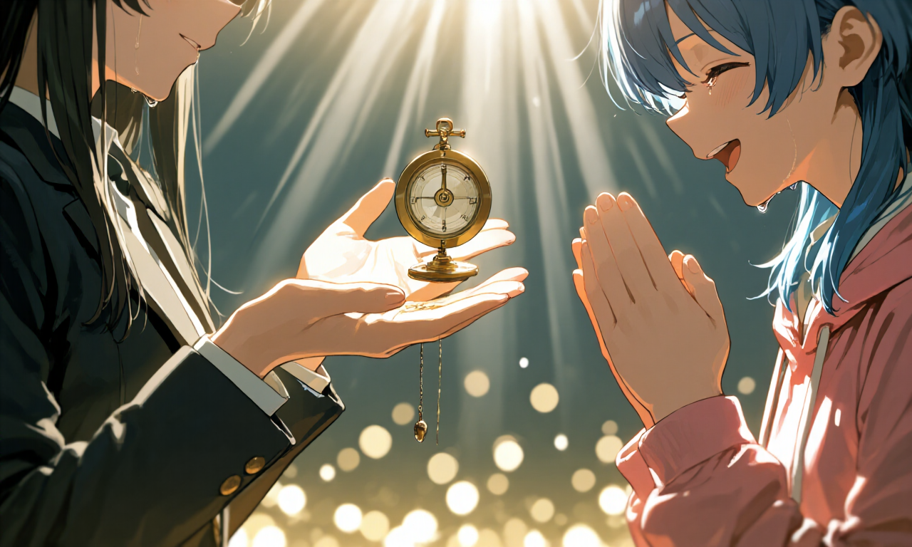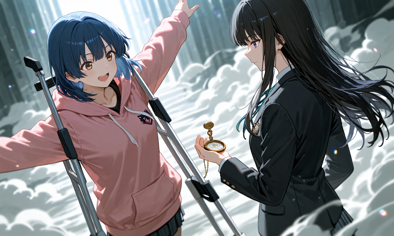 背後から届くりんちゃんの声は、霧より冷たくて、霧より鋭い。 彼女は小さな真鍮の方位計を手のひらで転がしながら、何度も角度を変えて覗き込んでいる。