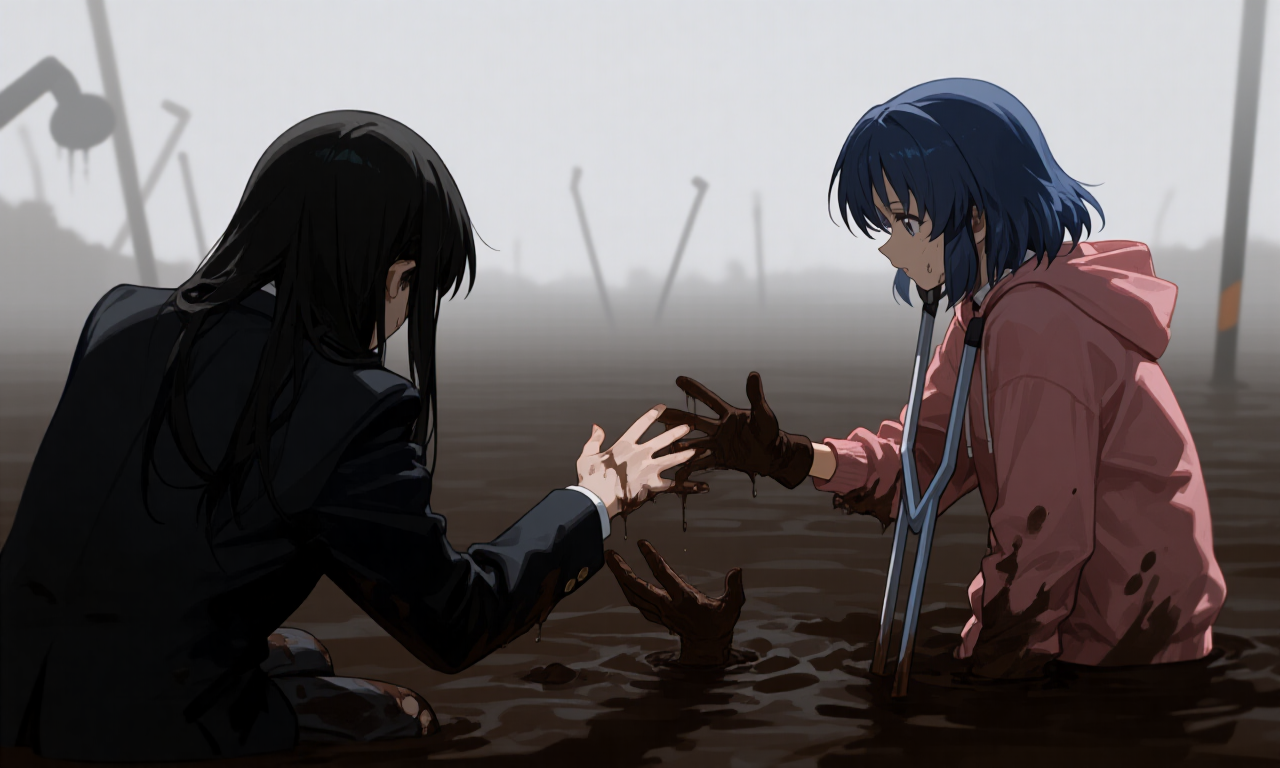 あたしは泥に沈む“手”を横目に、松葉杖でバランスを取りながら叫んだ。 右足がズキッと痛むたび、視界が白い霧と一緒にぐらつく。