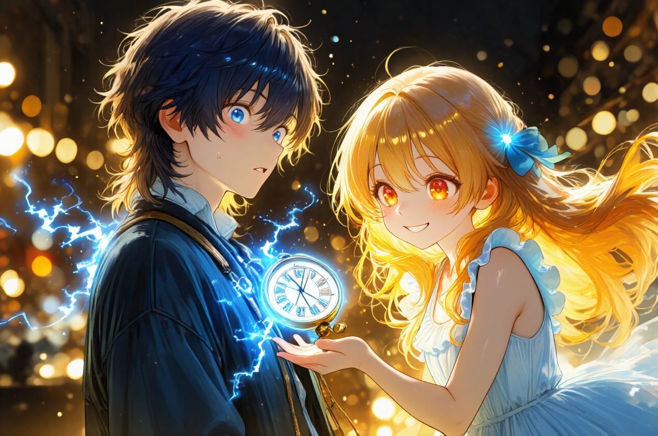 朝の港町エルネアは潮風とパンの香りに包まれ、漁師の掛け声が日常のリズムを刻むが、眠たげな静けさが街全体をやわらかく包んでいる。 ところが僕――アリアは魔法が使えないのに分厚い魔導書を抱えて歩き、その矛盾を自嘲しつつも革表紙の重みとページの角の感触に救われていた。 深い紺の髪に混じる黄金のハイライトが朝日に反射し、考え事のたびに指先でとんとんと刻む癖が昔のまま戻ってくる。 頭上からエルネア名物の強欲カモメが急降下し、理論魔法で軌道と風速を計算して回避しようとするも紙一重で掠められて魔導書を落としかけ、慌てて抱え直す。 港の老人に「カモメ相手に理論は無理、パンの匂い最強だ」と茶化され、苦笑しながらもこの何気ない朝が嫌いではないと自覚する。 魔法が使えず“失敗作”と呼ばれても、この街は僕を追い出さず、だからこそ魔導書を抱える矛盾した学生として歩き続けられる。 図書館の扉を開けば港の喧騒は嘘のように消え、紙とインクの匂いだけが漂う静寂が心を整えてくれる。 いつもの窓際に座り、懐中時計型の魔力制御装置を机に置くと、銀の蓋の細工が光り「本当にやるの」と責めるように見えた。 小さく「今日こそは」と呟いて装置を起動するとレンズの奥で鈍い青が灯り、針が震え、わずかな魔力の気配が生まれる。 理論どおり構築式を組み、流量を最小に抑え、揺らぎを抑制して紙片の浮遊を試みるが、紙はふわりと浮きかけて諦めるように落ちた。 装置の針は「無理です」と言わんばかりにゼロへ戻り、青い光もしゅんと萎み、僕はまた失敗を噛み締める。 指のリズムは焦りのテンポに変わり、母レイナの冷たい声「あなたは失敗作ね」と視線が脳裏を刺す。 幼少期に完璧を求められ、一度の式の誤りで才能を切り捨てられた記憶が、今や紙一枚も浮かせられない現実と重なって自嘲を濃くする。 窓外で港の光は揺れ、世界は動くのに僕だけが止まっている感覚が胸に沈殿する。 図書館を出て潮風の感触を受け、防波堤へ向かい海を眺めて思考の整理を試みるが、今日は違和感に足を止められた。 波の縁に灰色の層が薄く広がり、白い泡が粘って形を崩さず、砂にねっとりと残る異様さが目に焼きつく。 魔法の行使で生じる毒素“残滓”は世界に広がる病だが、比較的安全だったはずのエルネアの海辺にまで迫っていた。 指のリズムは乱れ、潮風に鉄のような苦味が混ざり、灰色が波打ちながらじわりと侵食を進めるのを目撃する。 港はいつも通りに働き、子どもが走り回る中、僕だけが世界の静かな蝕みを知ってしまったという予感に囚われる。 胸騒ぎを抱え市場の広場へ向かうと、中心で金色の髪の少女が太陽を跳ね返す光をまとい、ひまわりのように回っていた。 彼女は指を弾き「ピロリン♪」と不可思議な音とともに光の音符を弾けさせ、子どもたちを歓声で包む。 続けて「ぽわ〜ん♪」と擬音の魔法で音符をシャボン玉のように膨らませて空へ飛ばし、理論も式も見せずに魔法を奏でる。 僕は呆然と立ち尽くし、少女がこちらを見て一瞬動きを止め、僕の髪の黄金のハイライトに視線を留めていたのを感じる。 確信めいたいたずら笑みを浮かべて駆け寄った彼女が「ほら、こうやって」と近づいたとたん、腰の懐中時計がカチリと鳴った。 僕が魔力を流していないのに装置がほんのり熱を帯び、蓋の隙間から青い光が漏れ、鼓動に同調して脈打つのがわかる。 少女――アイリスは嬉しそうに目を細め、どこか懐かしさを含む笑顔で「魔法は胸の奥がきゅんってしたら出るんだよ」と言い切る。 僕が「説明になってない」と戸惑えば、彼女は「じゃあぽわ〜んは?」と返し、軽やかな冗談が周囲の空気を明るく跳ねさせた。 アイリスと名乗る彼女にアリアと名乗り返すも言葉が続かず、理論無き魔法が奏でる音色に胸の奥が温かくざわつく。 海の灰色を見た時の不安と違うが静まらない感覚が芽生え、光の音符が弾けるたびにその鼓動が強まる。 彼女がくるりと回って笑うと、世界の灰色が存在しないかのような光の層が広場を満たし、子どもたちの笑い声が響いた。 アイリスが去っても光の音符は漂い続け、僕はその場に立ち尽くし「なんなんだ、あの子」と胸のざわめきを言葉にできずにいる。 指先は今までで一番速いリズムを刻み、心が勝手に動いているようで止められない。 灰色の海の気配がアイリスの光で一瞬遠ざかったように感じ、魔法は理論だけではないのかもしれないという疑念が芽吹く。 図書館へ戻ると、窓際の席に懐中時計型の制御装置を置き忘れていたことに気づき、慌てて手を伸ばす。 誰も触れていないのに装置がカチと鳴り、レンズ奥に青い光が脈動して再び灯る。 指先にアイリスのそばにいた時のような微かな温度が残り、空気はびりびりと震えて懐中時計が生き物のように呼吸していた。 胸のざわつきはより深く強く響き、世界の灰色とひまわりのような少女とこの装置の鼓動が一本の線で未来へ繋