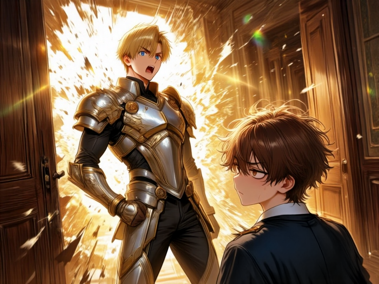 応接室の重厚な扉が、物理法則を無視した勢いで弾け飛んだ。 現れたのは、白銀の鎧を太陽のように輝かせた男――レオン・ヴァルクス。