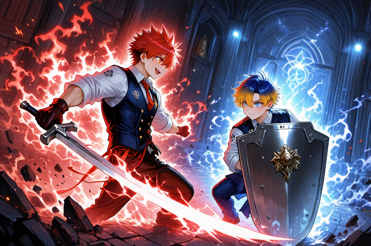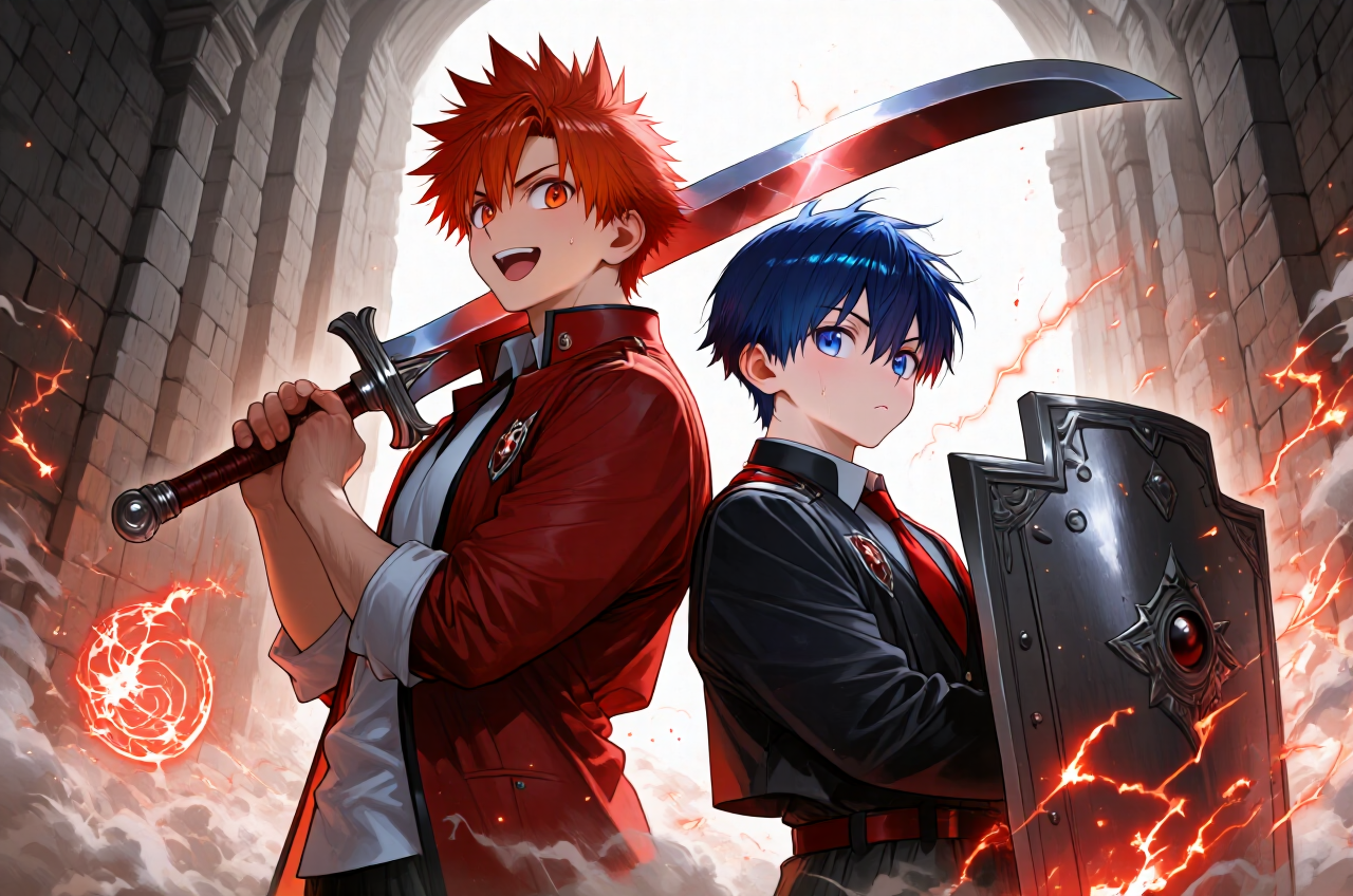 僕が刻むリズムが、訓練場の空気に波紋となって広がる。 「よっしゃあッ! 俺の魂(マイソウル)を……受け取れェッ!!」 クロスがクレイモアを振り下ろす。――ドゴォォォォンッ!! 地鳴りに等しい衝撃波が炸裂する。 「っ……クロス、強すぎる! 波形が乱れる!」 「アリア殿、今です! 僕の『鐘』でノイズを遮断しますッ!!」 リアムが盾を地面に突き立てた。――ゴォォォォンッ!! 重厚な寺院の鐘のような音色が、クロスの荒々しい衝撃を無理やり一つの指向性へ束ねる。