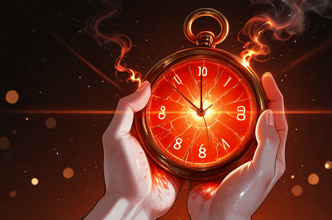 懐中時計が、まるで真っ赤に熱した鉄の塊のように、僕の皮膚をジリジリと焼いている。 慌てて時計を手に取り、レンズを覗き込む。揺らぐ文字盤の奥で、赤いデジタル数字が激しくノイズを走らせていた。