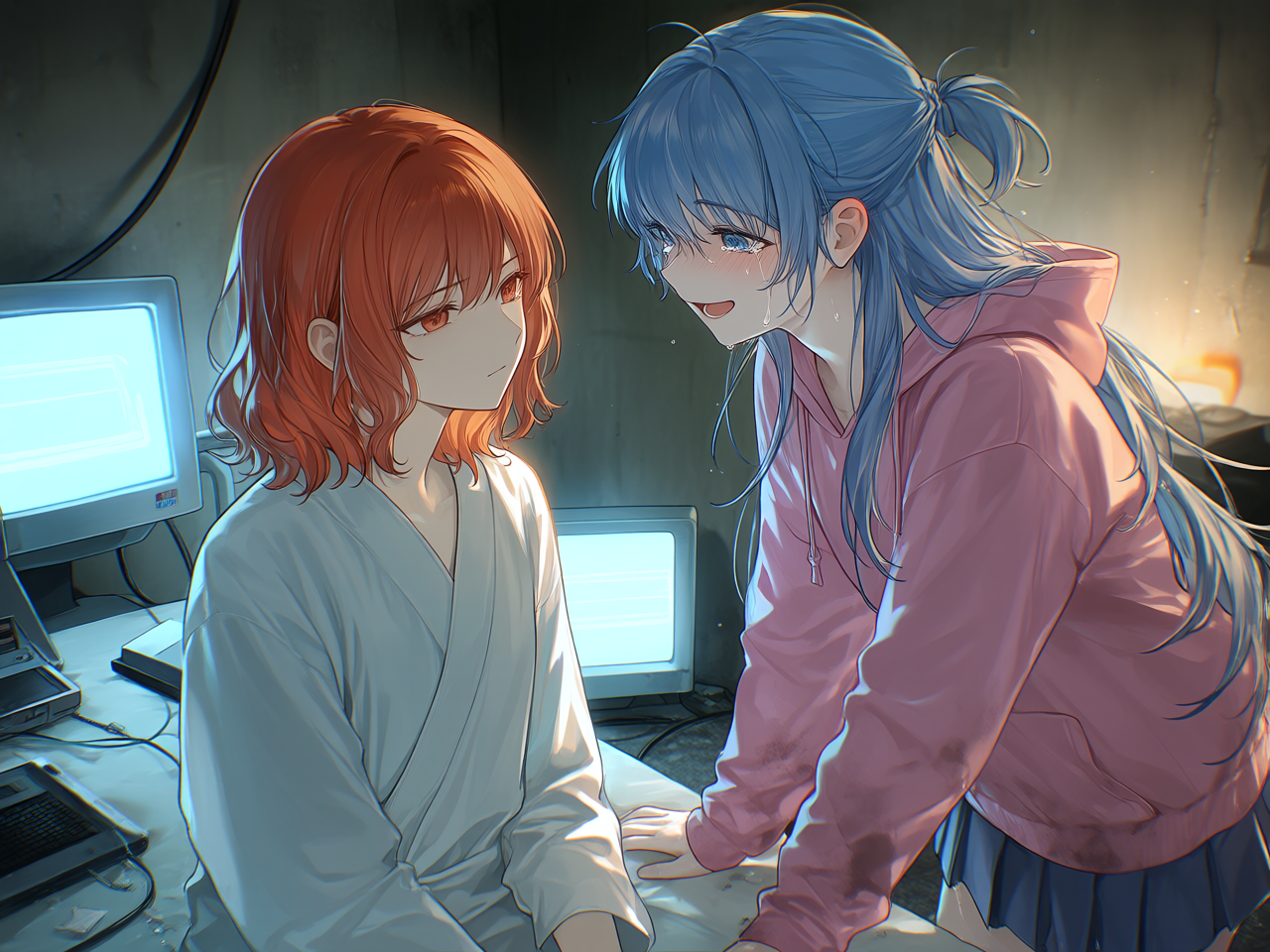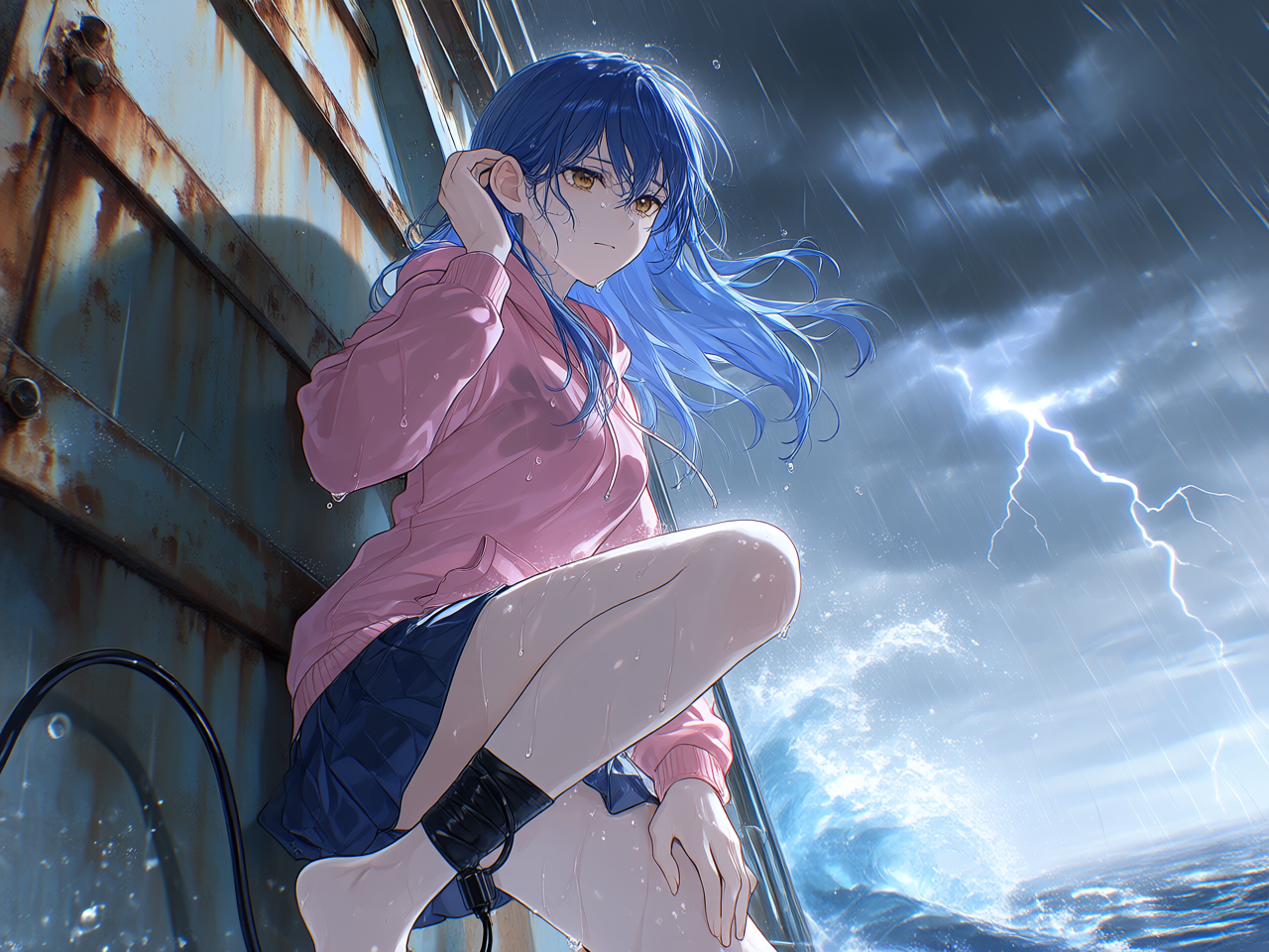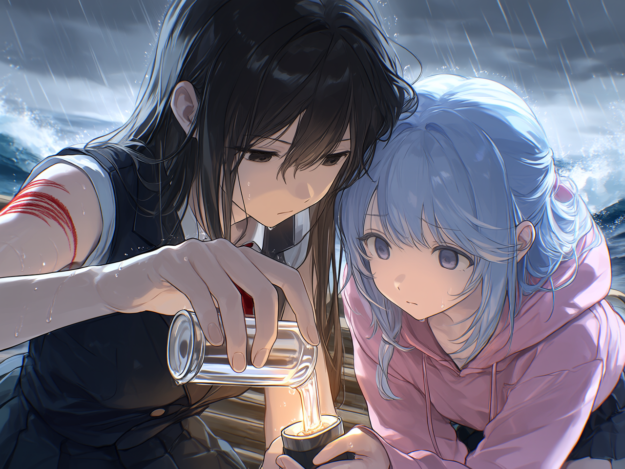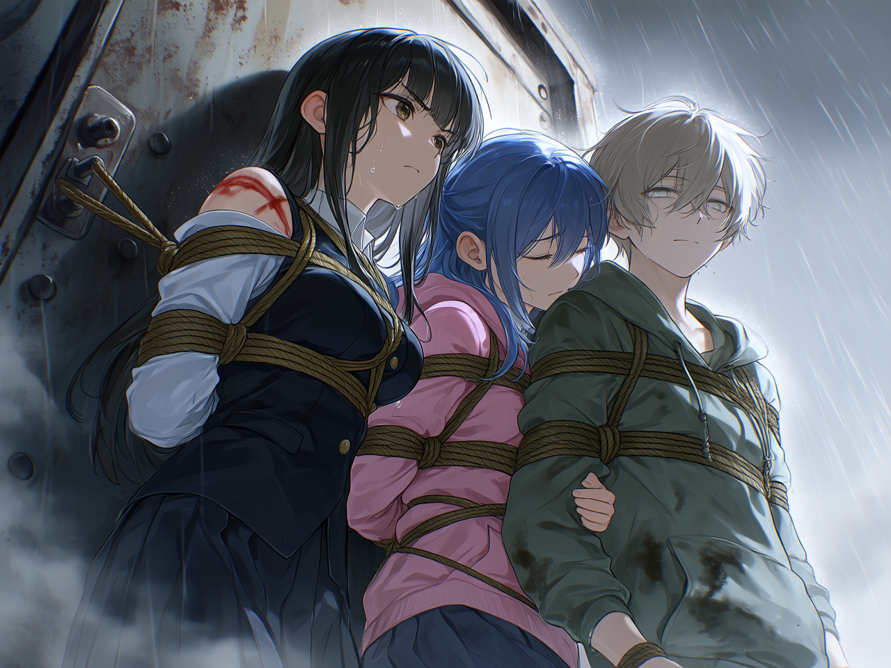 あらすじ 観測塔に到着した三人は、冷たい豪雨の中でフェンダーが壁に軋む音を聞きながら、鉄扉越しに初めて直接届くもみじのかすかな生の声を確認し、昂ぶりと不安のまま扉に耳を寄せた。 りんは袖なしジャケットから白い肩を覗かせるほどの過負荷で熱を放ちながら取っ手を引くが、外水圧と構造歪みによる抵抗で扉は動かず、ハルは外圧約1.8気圧・荷重約2トン・開放確率0.001%未満と冷静に見積もる。 内側の咳込み混じりの声は「中からも開かない」と告げ、なぎさの胸は冷え込むが、りんは「不可能を修理する」と宣言し、外圧に対抗して逆の圧を与える方針に切り替える。 素材はイカダのスチールラック支柱、ライターの油、なぎさの鏡の破片を用い、ハルの逆止弁設計を応用して扉隙間にガスを注入・局所加圧する指向性爆弾で一瞬の均衡を作る計画が立てられる。 ハルは歪みを外側から押し戻し零点でスライドさせる理屈を式に落とし込み、成功率を65%まで引き上げる一方、失敗時の内爆で内部の危険を明言する。 もみじは激しい咳をこらえて制御盤の下に身を守ると応答し、なぎさは「りんの修理はパフェのトッピングより正確」と励まし、三人は準備を急ぐ。 りんはライターを受け取り、ハルはペットボトル靴の端材からパッキンを切り出して気密を確保し、三人の指先がイカダ上で重なって一体としての作業が進む。 最終工程でりんはナイロンロープを自分の腰となぎさの腰に巻き、さらにハルも含めて三人の体を結束し、「一本の楔」として爆圧に耐える質量へと編成する。 なぎさは右足の感覚が薄いままでもりんの脚間に自分の脚をねじ込み、止血帯の痛みに耐えながら密着の熱と連結の感覚で意識をつなぎ止める。 ハルは秒読みを行い、爆圧の指向性を92%に固定し、気密維持を確認してタイミングを告げ、りんは導火線に火を移す。 鏡の破片で着火火花を増幅したチャージが隙間で一点爆発を起こし、破壊音ではなく歪みを押し戻す「暴力的な修理」の轟音が塔内外に響く。 衝撃波が三人を強く揺さぶるが、結束した質量がバラけず、なぎさは右腕でりんの腰に食らいつき、ハルは無言でなぎさの腰を締め上げて耐える。 局所加圧に屈した扉はガコンと数センチ内側へスライドし、ハルは歪み0.2ミリ以下・均衡点到達を報告、りんは取っ手を渾身で引く。 なぎさも全体重で後ろへ倒し込み、止血帯の激痛を加速剤に変えて押し切ると、長く孤独を閉じ込めていた鉄扉が火花とともに大きく口を開いた。 吹き出すのは潮の臭いではなく、消毒薬や生活の匂いで、白い蒸気が立ちのぼり、役目を終えたロープがほどけて床へと落ちる。 泥水が一気に流れ込み、三人は足をさらわれてコンクリ床に転がり込むが、なぎさは自嘲混じりにつぶやきつつ素早く顔を上げ、内部の様相に息を呑む。 そこは手入れの行き届いた精密機器と無機質なコンクリ壁が並ぶ異世界で、中央の予備バッテリーのオレンジ光の中、咳に肩を揺らす少女が座っていた。 透き通る肌と夕日のような赤みの髪、足元の回路の残骸と無機のモニタ光を映す瞳には、全データを掌握する鋭さと砕けそうな儚さが奇跡的に両立していた。 無線越しの「管理者の巨人」ではない等身大のもみじが「本当に来てくれたのね」と震えた声で告げ、孤独な観測と祈りの時間の重さが空気ににじむ。 りんは息を荒げつつも工学者の目で呼吸の乱れと内部ノイズを分析し、一歩で距離を詰め「遅くなりました」と告げ、ハルはノートに「孤独のリペア成功」と書き記す。 なぎさは左腕を抱え裸足を引きずりながら最高の笑顔で「特大パフェは食べられたけど最高の仲間を連れてきた」と冗談を混ぜ、痛みを出会いのスパイスに変換する。 もみじは泣き笑いの表情で手を伸ばし、泥の頬に熱い指先を触れさせ「そんなボロボロに」と咳き込みながら信じていたと打ち明け、四人の温度が混ざる。 りんは機械だけでなく人の「不可能」も修理する王様としての眼差しを保ち、なぎさの軽さはチームの緊張を解き、ハルの計算は絶望を越える橋になった。 外では黒い壁と雨音が世界を呑み込もうとしているが、観測塔の扉はもう閉ざされず、内外の結合が成立し、新しい鼓動が鳴り始める。 この作戦は外圧と磁気固着という拒絶のバグを、局所加圧と質量結束というハックで上書きする「破壊ではない修理」の証明となった。 鏡の破片は単なる着火強化ではなく、なぎさ自身が運命を反射させて光へ導く象徴となり、スチールパイプは絶望の隙間に差し込む楔へと変わった。 ナイロンロープは安全具を超えて一個体の境界を繋ぐ臍帯となり、気密パッキンは恐怖の漏れを防ぐ理性の輪となり、三人の総体が修理道具になった。 もみじの部屋に満ちる消毒薬の匂いは、過去の医療的記憶と現在の救いを橋渡しし、予備電源の橙光は尽きない居場所の灯りとして四人を包んだ。 りんの限界駆動の湯気は代償の大きさを示しつつも、彼女が選ぶのは焼け付きながら